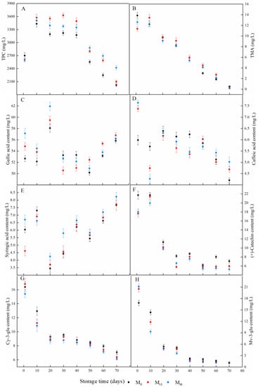 The content changes of phenolics in M0, Mt3, and Mt6 during storage. (A) TPC; (B) TMA; (C) gallic acid; (D) caffeic acid; (E) syringic acid; (F) (+)-catechin; (G) Cy-3-glu; (H) Mv-3-glu.