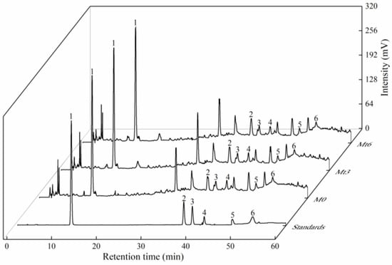 The samples of M0, Mt3, and Mt6 were analyzed by the HPLC system at 280 nm. Based on the retention time and UV-vis spectrum of the corresponding standards, the main phenolic compounds, including gallic acid, caffeic acid, syringic acid, (+)-catechin, Cy-3-glu, and Mv-3-glu were separated and analyzed as shown in Figure 4.