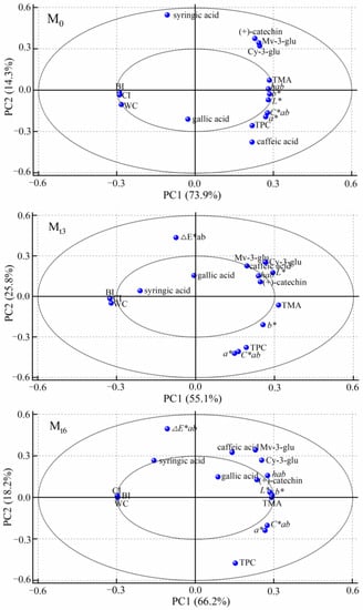 In this study, principal component analysis (PCA) was used to illustrate the correlation pattern between the colour characteristics and the main phenolic compounds in red wine. PCA is often used to interpret data, and correlation loading plots are used to represent the results. The correlation loading plots are bounded by the positive and negative correlations of research objects. Generally speaking, closer potential variables or factors have greater positive correlation; more distant potential variables or factors have greater negative correlation. Figure 5 shows the correlation loading plots for colour characteristics and main phenolic compounds in the M0, Mt3, and Mt6 samples. The correlation patterns of the treated wines (Mt3 and Mt6) were similar to that of M0, which was consistent with the changing trend of colour characteristics and the main phenolic compounds during storage, described in Section 3.3 and Section 3.4. Specifically, in all samples these variables or factors (BI, WC, CI, L*, b*, hab, TPC, TMA, (+)-catechin, Cy-3-glu, Mv-3-glu) had higher loading on PC1, reflected in the information of the indexes of 11 variables or factors. Among these, L*, b*, hab, TPC, TMA, (+)-catechin, Cy-3-glu, and Mv-3-glu had positive correlations, while BI, WC, and CI had negative correlations. Significant positive correlations existed among L*, b*, hab, TPC, TMA and (+)-catechin, Cy-3-glu, Mv-3-glu, while significant negative correlations existed among BI, WC, CI and L*, b*, hab, TPC, TMA, (+)-catechin, Cy-3-glu, Mv-3-glu. The variables or factors of caffeic acid, Cy-3-glu, and Mv-3-glu in all samples had higher loading on PC2, reflected in the information of the indexes of 3 variables or factors, and these variables or factors had positive correlations. In general, microwave irradiation did not change the correlations between the contents of main phenolic compounds and colour characteristics. A positive correlation between TMA and L*, b*, hab was also observed [41]. A positive correlation between b*, hab, and (+)-catechin, Cy-3-glu, Mv-3-glu was also observed [42], and the decrease of b* and hab values might be due to the formation of sufficient pigments (anthocyanin complexes or anthocyanin derivatives), which resulted in the decline of (+)-catechin and Cy-3-glu, Mv-3-glu. Considering the increase of WC, CI and the decrease of (+)-catechin, Cy-3-glu, and Mv-3-glu during storage, the results of PCA suggested that the increase of red colour and the depth of wine might be due to the copigmentation among (+)-catechin, Cy-3-glu, and Mv-3-glu during wine storage, thus stable anthocyanin-catechin polymers were formed, and the visible spectrum was increased. Considering the increase of BI and content changes of (+)-catechin during storage, the PCA results suggested that the increase of yellow colour might be related to the formation of yellow xanthylium cation pigments through multi-oxidation and decarboxylation reactions of (+)-catechin [25]. These results showed that microwave radiation did not change the correlations between colour characteristics and main phenolic compounds, but accelerated the aging trend of colour properties and main phenolic compounds during storage.