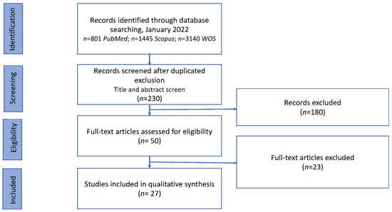 A total of 230 records were identified in the databases applying the exclusion and inclusion criteria and after duplicate removal. Once the title and abstract had been studied, 50 papers were submitted to the full-text evaluation. In total, 27 articles were included in this scoping review. Final search results are shown in the PRISMA flow chart (Figure 1).