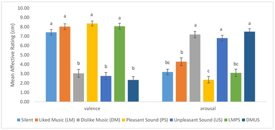 Mean ratings of valence and arousal during consumption of chocolate ice cream under various music and sound conditions. Different letters a, b, c indicates changes in mean affective ratings readings with different superscripts indicating significance (p < 0.05). Error bar indicates standard error.