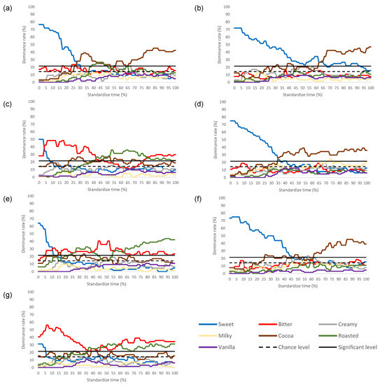 In the LMPS condition, sweetness was the first dominant attribute that started at a maximum dominance rate of 75% that slowly decreased from 0–45% ST. Cocoa was the next dominant attribute from 62% ST to 100% ST, reaching a maximum rate of 45.30% at 88% ST.