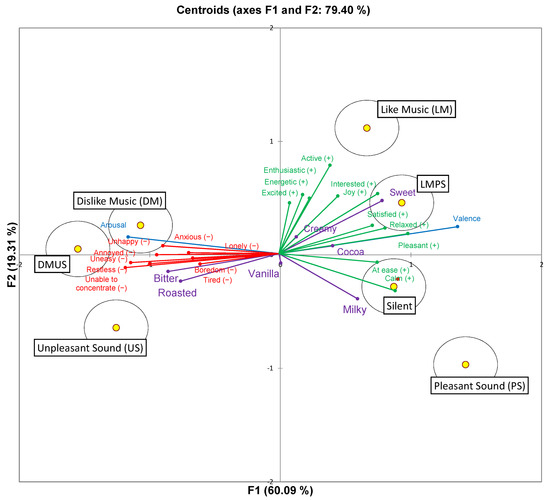 Figure 4 shows a clear separation of ice cream consumed under different music and sound conditions in terms of emotions and sensory perception, with the first factor explaining 60.09% of the variance in the data. The LM and LMPS conditions were correlated to the affective states of valence and associated with the positive emotions of pleasant, relaxed, satisfied, joy, interested, and active. The silent and PS conditions were associated with positive emotions of being calm, at ease, and pleasant on the other. These conditions were associated with sweetness, cocoa, and milky flavours. DM, US, and DMUS conditions were correlated with the affective states of arousal and to the negative emotions of uneasy, unhappy, anxious, tired, lonely, boredom, restless, annoyed, and unable to concentrate. These conditions were associated with bitterness and roasted flavours. The second factor (F2) accounted for 19.31% of the variance and further differentiated between PS and LM conditions. LM was associated with positive emotions of enthusiastic, energetic, active, and excited. PS were associated with fewer emotions (pleasant, at ease, and calm).