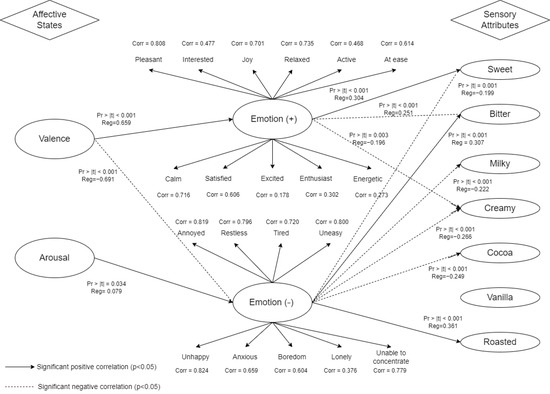 PLS-PM showing only the significant correlations between affective responses, self-rated emotion measures, sensory attributes, and perceptual correlates. To aid visualisation, positive correlations are indicated with continuous lines, and negative correlations with dashed lines.