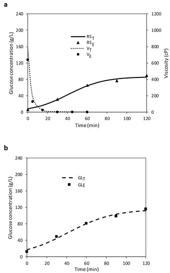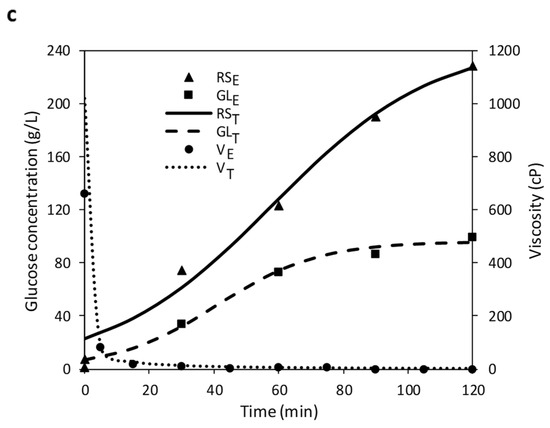 (a) Evolution of experimental and theoretical reducing sugar concentration (RSE and RST, respectively) and viscosity curve (VE and VT) during liquefaction of trial No. 16. (b) Evolution of experimental and theoretical glucose concentration (GLE and GLT) during saccharification of trial No. 16. (c) Evolution of RSE, RST, GLE, GLT and VT and VE during simultaneous hydrolysis of the trial No. 16.