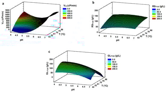 The optimum conditions for viscosity descent rate (Vmi) were observed at pH 6.91 and 67 °C (Table 3 and Figure 3a). These conditions are similar to those obtained in LIQ, which shows that Vmi was not influenced by the presence of glucoamylase. All the viscosity curves dropped rapidly, reaching values below 70 cP from the initial ones (between 400–950 cP) in 15 min. Figure 1c illustrates this trend in trial No. 16. It is therefore not a problem in any of the pH or temperature conditions studied, and Vmi was not used for the optimization process.
