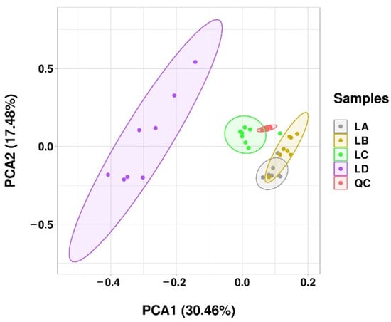 PCA analysis of lipids in N. flagelliforme under various water loss points. LA, LB, LC, and LD represent samples with 0%, 30%, 75%, and 100% water loss, respectively. The QC samples were used to monitor and evaluate the stability and reliability of the experimental data. The dot in the ellipse represents independent biological replicates.