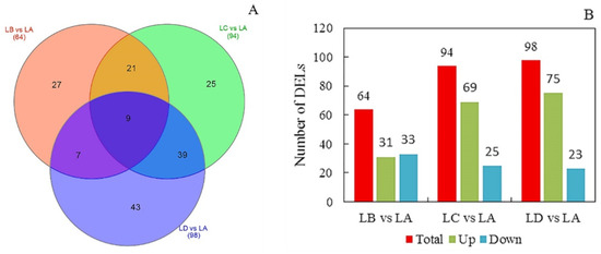 Distribution of identified DELs of N. flagelliforme in different stress groups compared to that in the control group. (A). Venn diagram showing the shared or unique DELs in stress groups vs. control group profiles. (B). Statistical analysis of DELs from three pairwise comparisons ((LB vs. LA, LC vs. LA, and LD vs. LA). LA, LB, LC, and LD represent samples with 0%, 30%, 75%, and 100% water loss, respectively. The total represents the total number of DELs identified in the comparison group, and the up and down represent the number of DELs up-regulated and down-regulated in the treatment group compared to the control group, respectively.