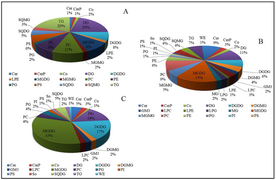 The classification of DELs in N. flagelliforme under drought stress. (A). The proportions of lipid species with significant differences in the LB group in comparison with the LA group. (B). The proportions of lipid species with significant differences in the LC group in comparison with the LA group. (C). The proportions of lipid species with significant differences in the LD group in comparison with the LA group. Lipid classes are presented as the percentage based on the total amount of DELs. LA, LB, LC, and LD represent samples with 0%, 30%, 75%, and 100% water loss, respectively.
