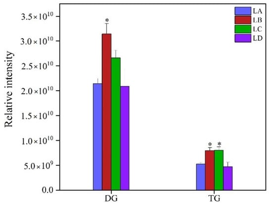 The changes in glycerolipid content and fatty acid compositions, including TG and DG, are summarized in Figure 4 and Figure S3. In comparison with the control group, DG class showed a trend of first increasing and then decreasing, and the total lipid content of DG class was the highest in LB the group, with an increase of 47.2%. Similarly, TG class showed the same trend and was up-regulated in the LB and LC groups. The (C29:1)- and (C31:4)-DG species were dominant in the DG class and were the major contributors to the increased DG content. Compared with the LA group, the lipid molecule species, including (16:0, 16:0), (16:0, 16:1), (18:3, 18:2), and (18:3, 18:3), were significantly up-regulated in the LD group. The (33:3)- and (12:0, 10:3, 11:3)-TG were the main components that determined the increase or decrease of TG. The relative intensities of (18:0, 18:0, 18:2)- and (18:0, 18:1, 18:3)-TG species were higher in the four groups, which were conducive to the accumulation of total TG.