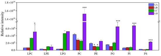 Changes of glycerolphospholipid contents in N. flagelliforme under drought stress. LA, LB, LC, and LD represent samples with 0%, 30%, 75%, and 100% water loss, respectively. Values were presented as the means ± SE of eight independent biological samples. According to Student’s t-test (* p < 0.05 and *** p < 0.001), asterisks above the bars indicate significant differences between the treatment groups (LB, LC, and LD) and the control group (LA).
