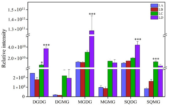 Changes of saccharolipid contents in N. flagelliforme under drought stress. LA, LB, LC, and LD represent samples with 0%, 30%, 75%, and 100% water loss, respectively. Values were presented as the means ± SE of eight independent biological samples. According to Student’s t-test (* p < 0.05 and *** p < 0.001), asterisks above the bars indicate significant differences between the treatment groups (LB, LC, and LD) and the control group (LA).