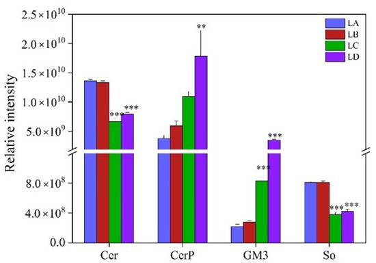 Changes of sphingolipid contents in N. flagelliforme under drought stress. LA, LB, LC, and LD represent samples with 0%, 30%, 75%, and 100% water loss, respectively. Values were presented as the means ± SE of eight independent biological samples. According to Student’s t-test (** p < 0.01 and *** p < 0.001), asterisks above the bars indicate significant differences between the treatment groups (LB, LC, and LD) and the control group (LA).