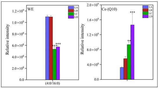 WE consists of only one fatty acyl chain, which is a (4:0, 16:0) carbon molecule. Compared with the control group, the expression intensity of WE in the LC and LD groups was reduced by 48% and 51%, respectively (Figure 8). However, the amount of Co (Q10) was increased with aggravation of drought stress in N. flagelliforme (p < 0.001), and the maximum rate was observed in the LD group, which was 3.54 times higher than the initial value.