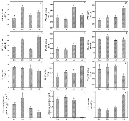 Physiological response of N. flagelliforme to persistent drought stress. Subfigures (A–I) show the activity of enzymes related to lipid metabolism in N. flagelliforme under drought stress. In addition, subfigures (J,K) represent net photosynthesis and photosystem II fluorescence parameters of N. flagelliforme during drought stress, respectively. Subfigure (L) displays the MDA content in N. flagelliforme during drought stress. LA, LB, LC, and LD represent samples with 0%, 30%, 75%, and 100% water loss, respectively. Values were presented as the means ± SE (n = 3). The different letters above the bars indicate that the means were significantly different (p < 0.05).
