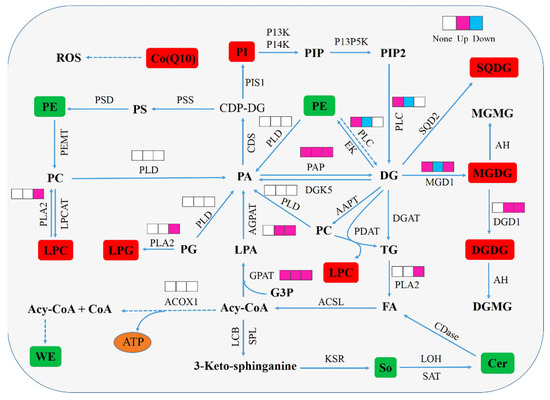 AAPT, aminoalcohol phosphotransferases; ACOX1, acyl-CoA oxidase; ACSL, long-chain acyl-CoA synthetase; AGPAT, 1-acylglycerol-3-phosphate O-acyltransferase; AH, acetylhydrolase; CDase, ceramidase; CDS, CDP-diacylglycerol synthase; Cer, ceramide; CerP, ceramides phosphate; Co, coenzyme; CPT, diacylglycerol cholinephosphotransferase; DELs, differently expressed lipids; DG, diglyceride; DGAT, diacylglycerol O-acyltransferase; DGD1, digalactosyl diacylglycerol synthase; DGDG, digalactosyldiacylglycerol; DGK5, diacylglycerol kinase; DGMG, digalactosylmonoacylglycerol; EK, ethanolamine kinase; EPS, exopolysaccharides; ESI, electrospray ionization; FA, fatty acid; G3P, glycerol-3-phosphate; GL, glycerolipids; GM3, gangliosides; GP, glycerophospholipids; GPAT, glycerol-3-phosphate acyltransferase; HRP, horseradish peroxidase; KSR, ketosphinganine reductase; LCB, sphingolipid Δ8 long-chain base; LOH, lag1 longevity assurance homolog; LPA, lysophosphatidic acid; LPC, lysophosphatidylcholine; LPCAT, LPC acyltransferase; LPE, lysophosphatidylethanolamine; LPG, lysophosphatidylglycerol; LPs, lysophospholipids; MGD1, monogalactosyl diacylglycerol synthase; MGDG, monogalactosyldiacylglycerol; MGMG, monogalactosylmonoacylglycerol; OCFAs, odd-chain fatty acids; OPLS-DA, orthogonal partial least squares discriminant analysis; PA, phosphatidic acid; PAP, PA phosphatase; PC, phosphatidylcholine; PCA, principal component analysis; PDAT, phospholipid diacylglycerol acyltransferase; PE, phosphatidylethanolamine; PEMT, PE methyltransferase; PG, phosphatidylglycerol; PI, phosphatidylinositol; PI3K, PI 3-kinase; PI3P5K, PI-3-phosphate-5-kinase; PI4K, PI 4-kinase; PIP, PI phosphate; PIP2, PI bisphosphate; PIS1, phosphoinositide synthase; PL, prenol lipids; PLA, phospholipase A; PLC, phospholipase C; PLD, phospholipase D; Pn, net photosynthetic rate; PS, phosphatidylserine; PSD, PS decarboxylase; PSS, base-exchange-type phosphatidylserine synthase; QC, quality control; ROS, reactive oxygen species; RSD, relative standard deviation; SAT, sphingosine N-acyltransferase; SE, standard error; SL, saccharolipids; So, sphingosine; SP, sphingolipids; SPL, sphingosine 1-phosphate lyase; SQD2, sulfoquinovosyl diacylglycerol synthase; SQDG, sulfoquinovosyldiacylglycerol; SQMG, sulfoquinovosylmonoacylglycerol; TBA, thiobarbituric acid; TG, triglyceride; TIC, total ion chromatogram; TMB, tetramethylbenzidine; UHPLC, ultra-high-performance liquid chromatography; VIP, variable importance in the projection; WE, wax esters.