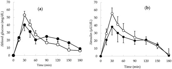 The values of blood glucose and insulin over time after the intake of the test meal minus the 0 min value were labeled Δblood glucose and Δinsulin, respectively. The incremental area under the curve (iAUC) was calculated by the trapezoidal formula and used as a dynamic parameter of the blood glucose and insulin levels. The statistical analysis was performed using SPSS software (IBM, Chicago, IL, USA). The time-course of the postprandial blood glucose and insulin levels and the differences in each kinetic parameter between white rice and apple consumption was statistically analyzed using the paired t-test, with values of p < 0.05 considered statistically significant.