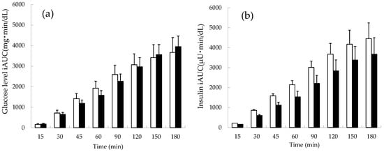 Cumulative incremental area under the curve (iAUC) of blood glucose and insulin in healthy normal subjects. (a) Blood glucose. (b) Insulin. □: rice-first group, ■: apple-first group (n = 10). No significant difference was noted between the rice-first and apple-first groups.