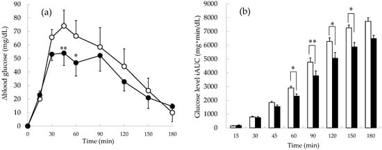 Postprandial blood glucose trends and cumulative incremental area under the curve (iAUC) in patients with impaired glucose tolerance. (a) Blood glucose level. (b) Cumulative iAUC value of blood glucose. ○: rice-first group, ●: apple-first group, □: rice-first group, ■: apple-first group. * p < 0.05; ** p < 0.01 (n = 9).