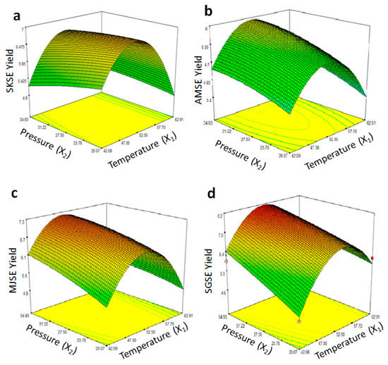 Response surface plots of process variables (temperature and pressure) and extract yields from Sukari (SKSE, (a)), Ambara (AMSE, (b)), Majdool (MJSE, (c)) and Sagai (SGSE (d)) seed extracts obtained using supercritical fluid (CO2) extraction (SFE).