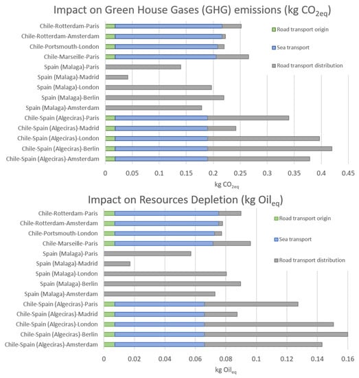 In both cases the contribution of the three supply chains (Chilean or European road and sea transport) of the freight are indicated by different colors in the stacked bars. As expected, for both the GHG emissions and resource depletion impacts the overseas transport presented a higher impact than the European internal road transport since, in this case, trips by oceanic freight are much longer than road trips. In our case, the maritime transport, from port (Chile) to port (Europe), presented an average of 0.17 to 0.20 CO2 eq/kg of avocado considering a direct non-stop trip that was fully loaded and returned with other foods. The route with the highest GHG emission was Chile to Germany (Berlin) through Algeciras port (Spain), which presented 0.42 CO2 eq/kg versus a direct road trip from Spain (Malaga) to Berlin with 0.21 CO2 eq/kg. The use of ports closer to the final destination significantly reduces impacts by decreasing road transport in Europe. However, it should be considered that the situation will be different if the avocados are transported from the destination ports in northern Europe to long-distance capitals in other European countries, since this will increase emissions due to long road transport. This is very important since more than 50% of the avocados consumed in Europe are re-distributed from the Netherlands [41] to the rest of the continent and CO2 emissions will increase since usually road transport is used. Similar studies have been performed in other fruits. For example, for banana from Ecuador, Roibás et al. [42] reported 0.23 kg CO2 eq/kg banana for overseas transport from Puerto Bolivar and Guayaquil harbors in Ecuador to Rotterdam (Netherlands). Chilean apple presents GHG emissions of 0.54 kg CO2 eq/kg, being the ocean freight from Chile (Valparaiso) to UK (London), a hot spot (0.21 kg CO2 eq/kg) that determined the performance of the product carbon footprint of exported apple with a contribution of 39.2% [22]. This result is similar to that reported here for the route Chile (Quillota) to UK (London) for avocado.