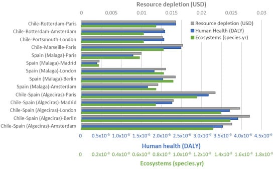One interesting observation reported in this paper is the three groups of endpoint categories quantified in Figure 2. ReCiPe endpoint calculation delivers a quantitative result for resources depletion (USD dollars), human health (DALY), and impact on ecosystems (species per year). National avocado road transport in Spain (from Malaga to the capital, Madrid, with a distance of 539 kms) provided the lowest impact compared to the combination of overseas transport and long road distance. According to the CED method, the different transport options of 1 kg of avocado are shown in Figure 3. As mentioned before, the national transport in Spain is the option with lower CED (0.82 MJ), followed by export from Spain by road to other European capitals with values between 3.5 MJ and 4.3 MJ. When export from Chile is considered, the option of oceanic freight to European ports closer to final destinations is clearly better with values between 3.8 MJ to 4.4 MJ than exporting Chilean avocados via Algeciras port, when CED values jump to values around seven MJ.