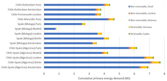 Cumulative primary energy demand (MJ) for the different routes of transport of 1 kg of avocados. Chile and Spain are considered as the travel origin; for Chile two options are considered: (i) export via Algeciras port and then using the same route as Spain exports (lower five bars) and (ii) export via Rotterdam, Portsmouth, or Marseille (as indicated in the four upper bars) and the road to the respective city.