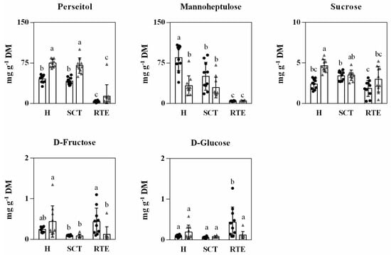 Abundance of main sugars in Hass avocado from two countries, Spain (black dots) and Chile (gray triangle) at harvest (H), after supply chain type (SCT) and at the ready-to-eat stage (RTE). Each column represents an average of 10 biological replicates and the standard deviation (SD) is represented by bars. Different letters indicate significant differences (p < 0.05) determined by ANOVA, followed by Tukey’s test.