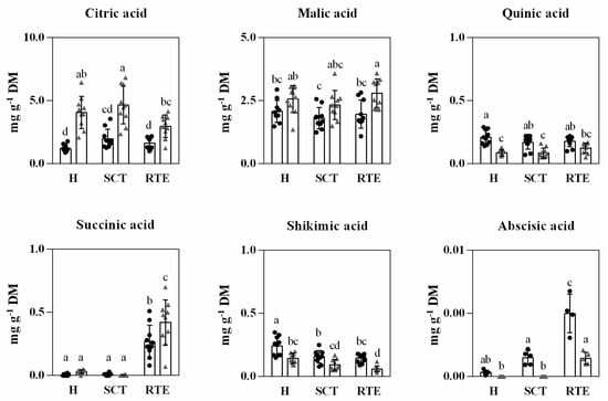 Abundance of main organic acids in Hass avocado from two countries, Spain (black dots) and Chile (gray triangle) at harvest (H), after supply chain type (SCT) and at the ready-to-eat stage (RTE). Each column represents an average of 10 biological replicates and the standard deviation (SD) is represented by bars. Different letters indicate significant differences (p < 0.05) determined by an ANOVA followed by Tukey test.
