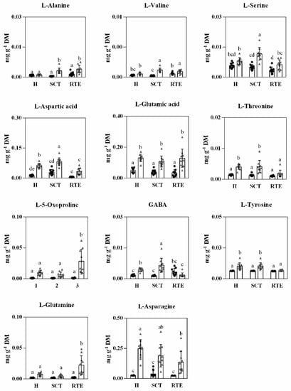 Abundance of amino acids in Hass avocado from two countries, Spain (black dots) and Chile (gray triangle) at harvest (H), after supply chain type (SCT) and at the ready-to-eat stage (RTE). Each column represents an average of 10 biological replicates and the standard deviation (SD) is represented by bars. Different letters indicate significant differences (p < 0.05) determined by an ANOVA followed by Tukey test.