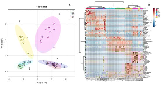 (A) Principal component analysis (PCA). (A) Score plot based on all primary and secondary metabolites measured of Hass avocado fruit representing a short (Spain) and long-distance supply chain (Chile): from harvest (HC and HS; for Chile and Spain), after the simulated transport chain (PHC and PHS; for Chile and Spain), and at the ready-to-eat stage (SLC and SLS for Chile and Spain). (B) Heat map based on cluster analysis using the Euclidean distance and Ward algorithm. Numbers 1-4 correspond to different clusters formed.