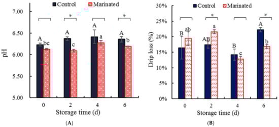 The pH (A) and drip loss (B) of the marinated pork and the control. Values are presented as mean ± standard deviation. Different letters above the bars highlighting the standard deviations indicate significant differences (p < 0.05). The asterisk indicates significant differences (p < 0.05) between treatments for each time.