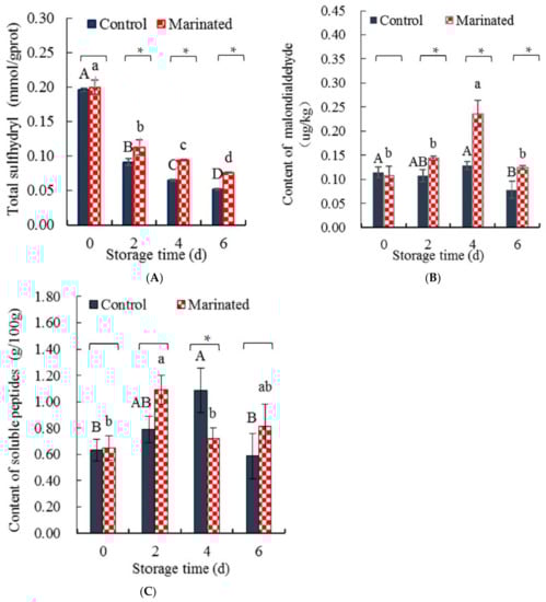 The content of sulfhydryl groups (A), MDA (B), and soluble peptide (C) in the marinated pork and the control. Values are presented as mean ± standard deviation. Different letters above the bars highlighting the standard deviations indicate significant differences (p < 0.05). The asterisk indicates significant differences (p < 0.05) between treatments for each time.
