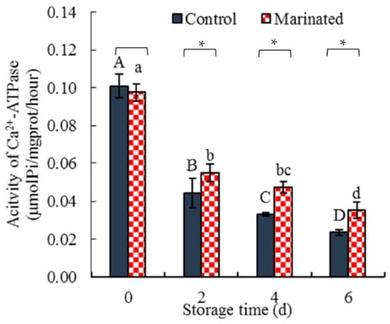 The activity of Ca2+-ATPase in the marinated pork and control. Values are presented as mean ± standard deviation. Different letters above the bars highlighting the standard deviations indicate significant differences (p < 0.05). The asterisk indicates significant differences (p < 0.05) between treatments for each time.