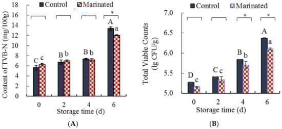 The TVB-N (A) and viable count (B) of the marinated pork and the control. Values are presented as mean ± standard deviation. Different letters above the bars highlighting the standard deviations indicate significant differences (p < 0.05). The asterisk indicates significant differences (p < 0.05) between treatments for each time.