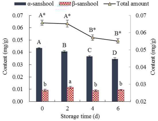 Numb taste is a typical flavor of Sichuan cuisine-marinated meat products owing to the addition of pepper or its essential oil [56]. Hydroxyl-α-sanshool and hydroxyl-β-sanshool are the key flavor substances in pepper [57]. Therefore, to analyze the changes in the numb taste of the marinated pork during cold storage, the contents of hydroxyl-α-sanshool and hydroxyl-β-sanshool were determined (Figure 5). As shown in Figure 5, the hydroxyl-α-sanshool content decreased significantly (p < 0.05) as the storage time increased. In fact, the hydroxyl-β-sanshool content increased significantly (p < 0.05) on the second day but decreased significantly (p < 0.05) from the second day to the sixth day. The total contents of hydroxyl-α-sanshool and hydroxyl-β-sanshool decreased significantly (p < 0.05) from the second day to the sixth day.