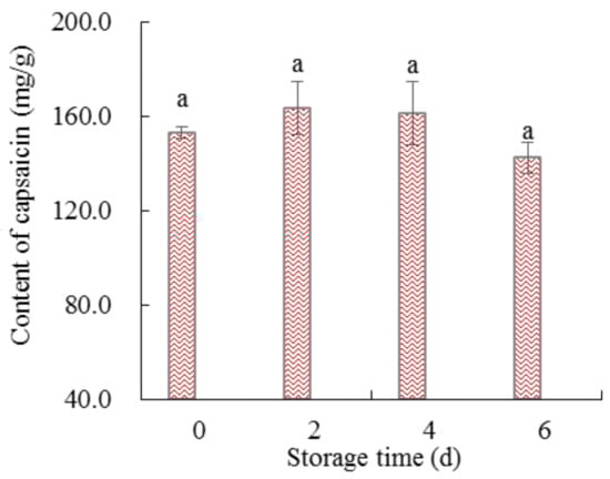 The content of capsaicin in the marinated pork. Values are presented as mean ± standard deviation. Different letters above the bars highlighting the standard deviations indicate significant differences (p < 0.05).