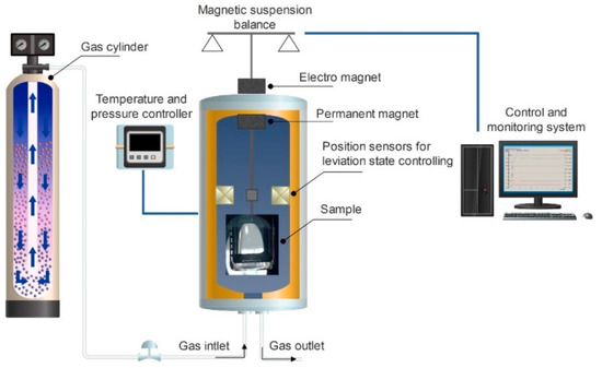 The phase equilibria behavior was studied by determination of the CO2’s solubility and the volumetric expansion of flour saturated with CO2. The solubility of CO2 is the total amount of carbonate species that can be dissolved in the solution. The solubilities of CO2 in different flour types were measured by a gravimetric method involving magnetic suspension balance (MSB, RUBOTHERM, Berlin, Germany) at pressures ranging from 1 to 350 bar (Figure 1). The applied MSB is designed for a maximum operating pressure of 350 bar and an operating temperature of 562 K. The temperature of the cell was kept constant using a Lauda P5 thermostat (Lauda, Königshofen, Germany). The measuring cell of the MSB has a sapphire window, which allows observation of the sample and estimation of volume modifications during the sorption measurements. The software MessPro (SL-2500-00216, Ver.11.05) recorded the conditions (mass, temperature, pressure). The duration of the measurement at each pressure was approximately 120 min, as equilibrium was reached after this time. To define the volume of the sample, a photo of the sample was taken with a digital camera and analyzed using ImageJ 1.52 software (Freeware).
