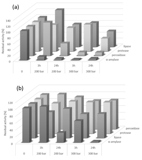 Figure 2a,b show the residual activities of the native enzymes α-amylase, lipase, peroxidase, and protease, and the same enzymes in wheat flour after scCO2 treatment under different conditions. The results in Figure 2a demonstrated that the native enzyme α-amylase is unstable, since its activity declined rapidly after three hours and 200 bar of scCO2 exposure. At 300 bar the decrease in its activity was even more significant. Similarly, a decrease in native peroxidase activity was observed to 12% after three hours of treatment at 300 bar.