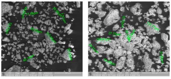 A laser diffraction particle size analyzer was used for the granulometric analysis of the wheat flour T500. A comparison of the particle sizes of untreated wheat flour and scCO2-treated wheat flour was made, where the average diameter of the untreated wheat flour granules was 60.6 µm and the average diameter of the scCO2-treated (300 bar, three hours) wheat flour granules was 70.7 µm. The increase in the average diameter of the wheat flour particle size can be attributed to the formation of aggregates, which is clearly evident when looking at Figure 3, showing the results of the ESEM analyses due to the presence of CO2 during exposure. The particle size measurements were repeated after a certain time (one week). The results demonstrated that the average particle size of wheat flour treated with scCO2 decreased to 61.2 µm, and after two weeks, it became equal to the initial value of the average particle size of untreated wheat flour (60.3 µm).