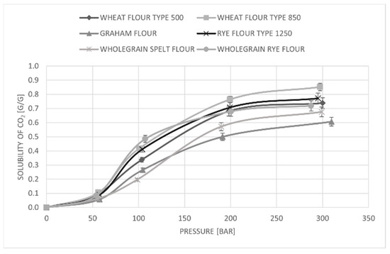 The CO2 solubility in different flour types was determined with a magnetic suspension balance (MSB), where the temperature and pressure range considered for these experiments were the same as the conditions of the scCO2 treatment used for enzyme inactivation. The solubility of CO2 in different flour types was measured at 35 °C. The obtained results are presented in Figure 4, where it was observed that the solubility of CO2 increased with pressure. The solubility of CO2 at 300 bar was the highest in wheat flour type 850 and rye flour type 1250, with a value of 0.85 g/g. Afterwards, the solubility of CO2 was a little lower in wheat flour type 500, continued with wholegrain rye flour and wholegrain spelt flour. The lowest solubility of CO2 was found in Graham flour (0.6 g/g). In addition, when the flour is exposed to a dense gas, penetration of the gas molecules into the flour occurs and starts changing the density of the flour–gas mixture. The number of penetrating molecules rises when using gas with higher permeability and more porous material. CO2 is recognized as a highly permeable gas, which can increase the density of a sample [50].
