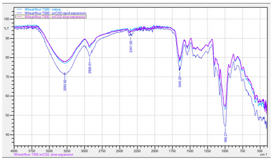 According to the above investigations, the treatment of wheat flour with scCO2 medium had a significant influence on enzymatic activity. In further research, the influence of scCO2 treatment on the primary structure and conformation of the non-treated wheat flour and the scCO2-treated wheat flour were investigated by employing an FTIR instrument. The results shown in Figure 5 indicate that no significant changes in the infrared spectrum of the treated wheat flour in scCO2 medium were observed in comparison with the untreated wheat flour. Nevertheless, the infrared spectrum of wheat flour T500 after scCO2 treatment shows stronger adsorption intensities for all characteristic peaks between the samples. The absorption spectrum of wheat flour shows a strong peak for water with a stretching vibration of O-H bonds at 3260 cm−1, which represents the presence of moisture in the flour [51]. Furthermore, peaks in the range from 3000 cm−1 to 2800 cm−1 correspond to stretching vibrations of the C-H bond, which could be attributed to the presence of polysaccharides, unsaturated lipids, and carbohydrates.