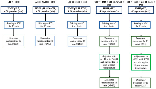 HMH solutions, dissolved to 4% proteins (w/v), were adjusted either to pH 7 with 6 M HCl or to pH 11 with 6 M NaOH or 6 M KOH and were stirred for 15 min at 4 °C before being treated by an ERV2 deaerator (Koruma, Neuenburg, Germany). Treatments were performed in closed circuit under 100 Torr for 30 min according to Todeschini et al. (2020) [8]. For the conditions implying a first deaerator treatment at pH 7 followed by another one at pH 11, each deaerator treatment was conducted for 15 min to maintain a short processing time. Moreover, before undergoing the second 15 min deaerator treatment, the HMH solution was basified to pH 11 and then stirred for 15 min at room temperature. Samples were collected after the 15 min stirring at 4 °C and then at each step of the protocol. They were stored at −30 °C and protected from light, before being further analyzed in terms of volatile compound contents and antioxidant activity. All the conditions (Figure 1) were tested in triplicate and in a random order.