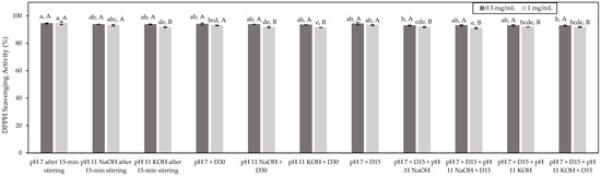 The DPPH test was also conducted to assess the antioxidant potential of the studied HMH and the impact of the different conditions. The DPPH test is based on the scavenging of DDPH free radicals by an antioxidant material. This scavenging results in a loss of the absorbance of the DDPH solution [15]. Results expressed as the percentages of DPPH scavenging activity were presented in Figure 3. Globally, all the tested conditions showed a similar DPPH scavenging activity at a tested concentration of 0.5 mg/mL of peptides (p > 0.05) with an average DPPH scavenging activity of 94% (Figure 3). Similarly to what was observed for the ORAC test, the DPPH scavenging activity of the pH 7 + D15 + pH 11 KOH + D15 condition was identified as being significantly lower than those of the other conditions by statistical analyses (p < 0.05). Nonetheless, as mentioned before, since the DPPH scavenging activity obtained for this condition was on the same order as the other conditions, the detected differences could be perceived as minor. At a tested concentration of 1.0 mg/mL of peptides, all the conditions showed an average DDPH scavenging activity of 92%. Despite the fact that statistical analyses identified the pH 7 after 15 min stirring and the pH 7 + D15 + pH 11 NaOH + D15 condition as being those with the highest and the lowest DPPH scavenging activity (p < 0.05), respectively, since the values were all in the same range, the detected differences could be considered as minor. In addition, for most of the tested conditions, the highest DDPH scavenging activity was obtained at a concentration of 0.5 mg/mL of peptides rather than 1.0 mg/mL of peptides (p > 0.05). This might be due to the potential occurrence of interference resulting from the presence of pigments in HMH solutions. In fact, the DPPH test is based on the change in absorbance of the DPPH solution; thus, the presence of colored compounds could lead to the underestimation of the antioxidant activity [41]. Since the HMH solutions at 1.0 mg/mL of peptides were more concentrated than those at 0.5 mg/mL of peptides and, as a consequence, their color was more pronounced, this could explain their lower antioxidant activity. It appears from these results that the assessed conditions had no impact on the antioxidant potential of HMH, similarly to what was observed with the ORAC test, and the same explanations could be involved. Interestingly, other fish protein hydrolysates such as catfish protein hydrolysate and cod protein hydrolysate evidenced DPPH scavenging activity equal to 30% and 19%, respectively [42,43]. The literature has also reported DPPH scavenging activity ranging from 52% to almost 80% for unfractionated silver carp protein hydrolysate and silver carp protein hydrolysate, respectively, composed mainly of low-molecular-weight peptides at a concentration of 2 mg/mL [35]. Therefore, in comparison with other fish protein hydrolysates, it seems that the studied HMH showed an important DPPH scavenging activity, even in an unfractionated state.