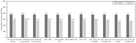 Antioxidant activity of the HMH solutions corresponding to the different tested conditions and determined by the DPPH test (mean ± standard deviation) expressed in µmol TE/g. Values with different lowercase letters (a–f) within the same concentration are significantly different p < 0.05 (Tukey test); values with different uppercase letters (A,B) within the same condition are significantly different p < 0.05 (t-test).