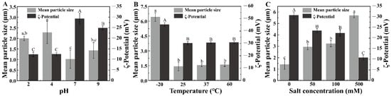 Mean particle size and ζ-potential of the Pickering emulsion under different environmental stresses. (A) pH, (B) temperature, and (C) salt concentration. Different letters indicate significant differences (p < 0.05).