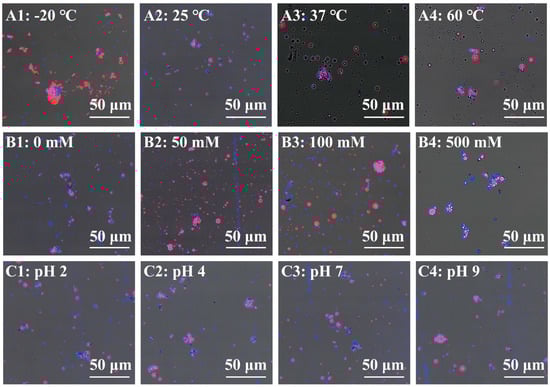 Confocal laser scanning microscopy (CLSM) images of the Pickering emulsion under different environmental stresses. (A1–A4) pH, (B1–B4) temperature, and (C1–C4) salt concentration.