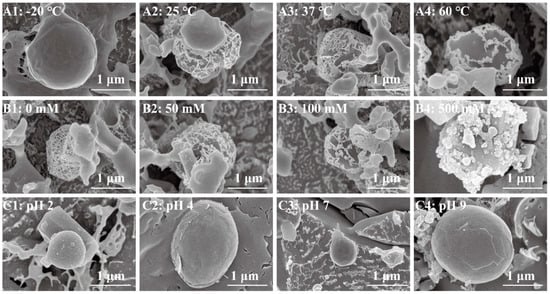 Cryo-scanning electron microscopy (Cryo-SEM) images of the Pickering emulsion under different environmental conditions. (A1–A4) temperature, (B1–B4) salt concentration, and (C1–C4) pH.