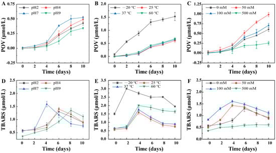 Chemical stability of the Pickering emulsion under different environmental stresses. (A–C) Peroxide value (POV) and (D–F) thiobarbituric acid reactive substance (TBARS) of the Pickering emulsion under different pH, temperature, and salt concentration conditions.