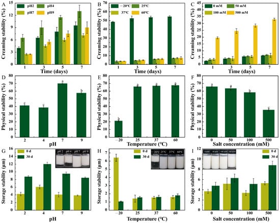 Physical stability of the Pickering emulsion under different environmental stresses. (A–C) creaming index (CI), (D–F) physical stability, and (G–I) storage stability of the Pickering emulsion under different pH, temperature, and salt concentration conditions. Different letters indicate significant differences (p < 0.05).
